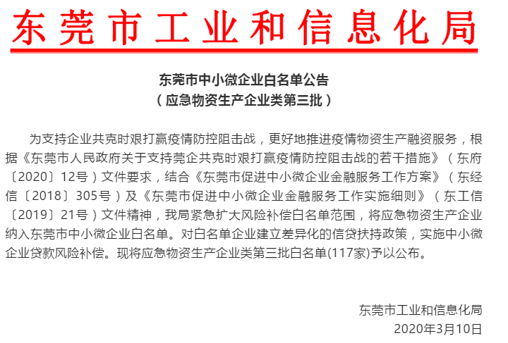 疫情防控期間,為了推動(dòng)企業(yè)順利復(fù)工復(fù)產(chǎn),東莞市陸續(xù)推出系列“暖企政策”,以“組合拳”的方式幫助企業(yè)解決復(fù)工復(fù)產(chǎn)中遇到的實(shí)際問(wèn)題。為全力支持和推動(dòng)新冠肺炎疫情防控物資和裝備生產(chǎn)企業(yè)復(fù)工復(fù)產(chǎn)、擴(kuò)大生產(chǎn),2020年2月27日,廣東省工業(yè)和信息化廳出臺(tái)了“支持新冠肺炎疫情防控物資和裝備生產(chǎn)企業(yè)擴(kuò)大生產(chǎn)的獎(jiǎng)勵(lì)政策”,支持疫情防控物資和裝備生產(chǎn)企業(yè)實(shí)施技術(shù)改造、擴(kuò)大生產(chǎn),獎(jiǎng)勵(lì)服從國(guó)家和省醫(yī)療防控物資調(diào)度要求的企業(yè)生產(chǎn)銷(xiāo)售。疫情防控啟動(dòng)以來(lái),為進(jìn)一步用好風(fēng)險(xiǎn)補(bǔ)償專(zhuān)項(xiàng)資金,東莞將應(yīng)急物資生產(chǎn)企業(yè)納入白名單。目前,東莞已將兩批共145家應(yīng)急物資生產(chǎn)企業(yè)納入白名單。